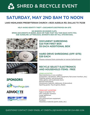 Paper Shredding - $10 FIRST BOX; $5 EACH ADDITIONAL: Shred truck destroys your documents on-site. Staples, rubber bands, and paper clips okay; no binders or binder clips, please.