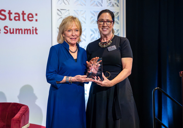 Texas Woman's University Shannon Mantaro (right), Texas Woman’s University’s executive director and chief officer of the JNIWL, presenting the JNIWL Distinguished Public Service Award to The Honorable Myra Crownover (left), a retired Texas House of Representatives member photo: Leo Gonzalez/TWU